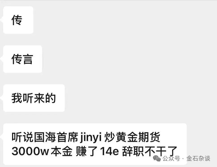上一次听说还是几千万赚了14亿。去年10月28日,根据网络传闻,国海某首席炒黄金期货,用3000万本金赚了14亿,然后辞职不干了。