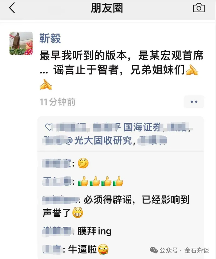 不过,该固收首席发了朋友圈进行澄清:“最早听到的版本,是某宏观首席;谣言止于智者,兄弟姐妹们”。