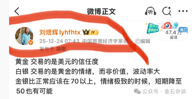 而知名经济学家刘煜辉也对金银走势给出了自己的判断:黄金,交易的是美元信任度;白银交易的是黄金的情绪,而非价值,波动率大;金银比正常应该在70以上,情绪极致时50也有可能。