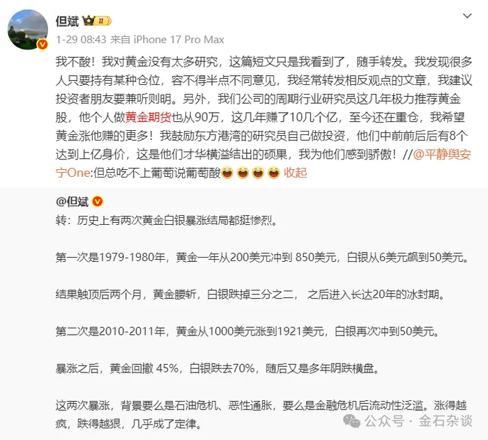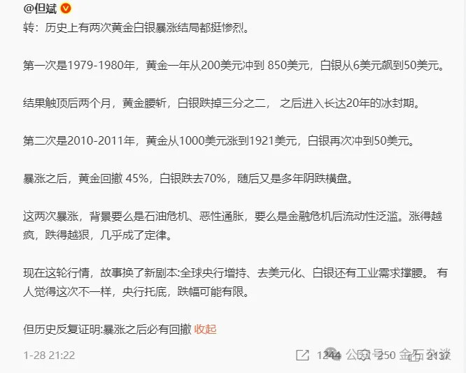 其实,在1月28日黄金白银巨震前,但斌彼时就已转过历史行情走势:历史上两次黄金白银暴涨结局都很惨烈。一次80年,一次2010年前后,黄金均腰斩,白银均跌70%。