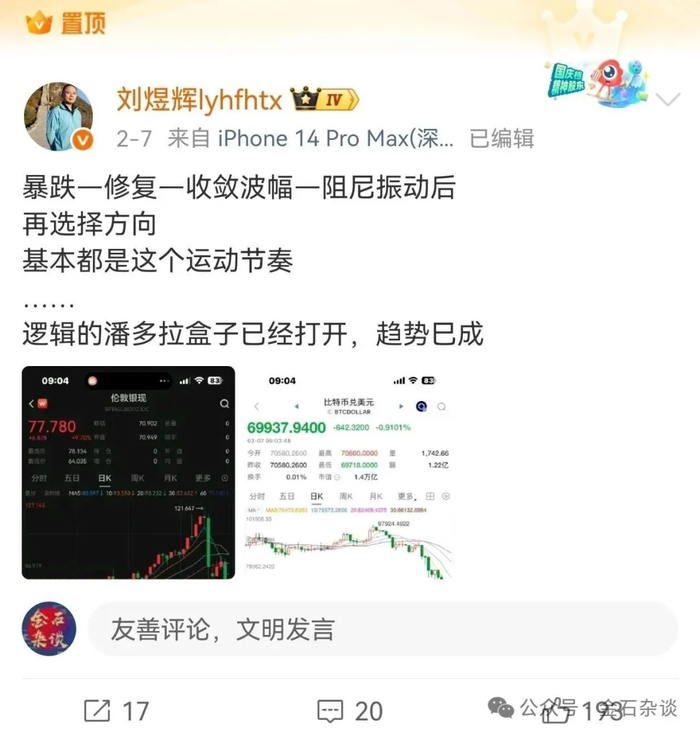 他还表示,逻辑的潘多拉盒子已经打开,趋势巳成 。对此有人疑惑他到底看空还是看多。根据其分享截图,一个是白银现货大跌的图,一个是比特币大跌的图。既然趋势已成,那大概率是下跌的趋势。根据此前他的动态: 2025年最熊的资产,你知道2026年最熊的资产吗?他还附图比特币和以太坊。基本可以敲定,他对2026年白银和虚拟货币的极度看空。